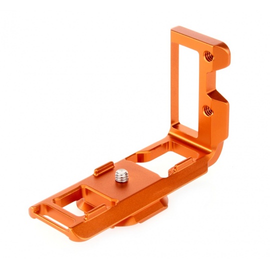 Délka držáku činí 100 mm a zadní hrana základny je zkosená pro lepší přístup k výklopnému displeji a k dalším důležitým funkcím fotoaparátu. Svislá součást je obrobena tak, aby neblokovala porty či bateriová dvířka fotoaparátu, a navíc může být namontována naopak, aby bylo možné připojit kabely z pravé nebo levé strany. Zároveň k destičce můžete připnout popruh, a to pomocí 1/4″ závitu nebo integrovaného očka.
