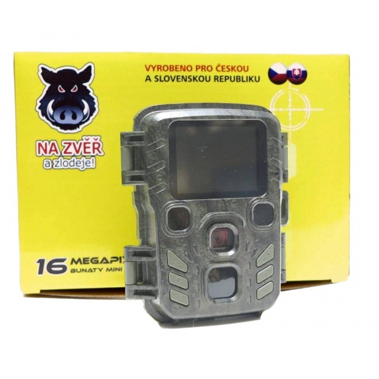 Nejmenší fotopast na světe se záznamem na sd kartu a úhlem snímání 52°. Nastavení fotopasti je opravdu snadné , menu fotopasti je samozřejmě v české jazyce, listovat v menu můžete pomocí šesti plnohodnotných tlačítek a vše vidíte na velkém barevném LCD displeji, právě díky těmto podstatným vlastnostem je fotopast BUNATY MINI FULL HD jiná než jiné malé fotopasti. Nenajdete na trhu žádnou jinou malou fotopast s tak velkým barevným displejem a takovým komfortem nastavení. Díky velkému displeji můžete také fotopast přesně zaměřit na sledovanou oblast, po přepnutí fotopasti do polohy fotografování začne na displeji odpočet času 45 vteřin , během této doby vidíte přesně na displeji co fotopast sníme, stačí jen jednoduše fotopast upevnit a namířit , po odpočtu času se fotopast sama přepne do aktivního režimu focení! Fotopast má rozlišení fotografií až 16 MP a video může natáčet, až v rozlišení FULL HD. I přes svou nízkou cenu fotopast má všechny pokročilé funkce včetně časovače a časosběru! Fotopast si můžete jednoduše nastavit od kdy do kdy má být aktivní, například jen v noci. Fotopast je možné připojit i na externí napájení. Vstup na externí konektor je ze spodu těla fotopasti. Mnoho jiných druhů fotopastí má nelogicky vstupní konektor v horní časti fotopasti a pak velmi často dochází k zatečení vlhkosti do elektroniky. U fotopasti BUNATY se Vám to nestane! U všech fotopastí BUNATY je samozřejmostí extrémně rychlá spoušť s možností nastavení sekvenčního fotografování, kdy fotopast zazamená pohyb a ihned pořídí ,až 3 fotografie v těsném sledu za sebou, máte tak jistotu, že Vám opravdu nic neunike! Podpora sd karet až do 32GB. Na běžnou SD kartu o velikosti 8GB se vejde až 9000 fotografií ! Fotopast na zloděje i na zvěř!