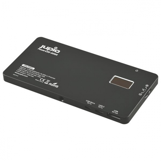 Přenosné světlo Jupio JPL200A kombinuje funkci světla a powerbanky. Světlo je vybaveno 100 LED diodami v 3200 K (teplé světlo) a 100 LED diodami v 5600 K (denní světlo) a má možnost upravit teplotu barev v celém tomto rozsahu.