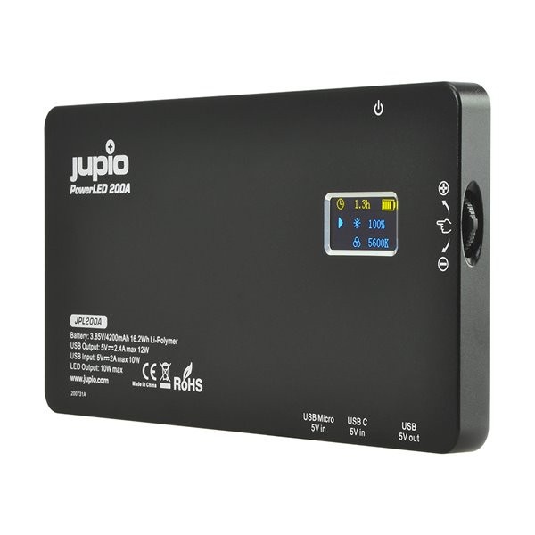 Přenosné světlo Jupio JPL200A kombinuje funkci světla a powerbanky. Světlo je vybaveno 100 LED diodami v 3200 K (teplé světlo) a 100 LED diodami v 5600 K (denní světlo) a má možnost upravit teplotu barev v celém tomto rozsahu.
