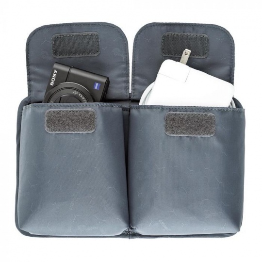 Konstrukce: 13 kompresních oček (z toho 9 na oboustranném vyjímatelném panelu) pro organizované uložení příslušenství (kabely, krytky, karty, redukce, adaptéry, baterky, nabíječky atd.), dvě pouzdra na suchý zip na druhé straně vyjímatelného panelu.
