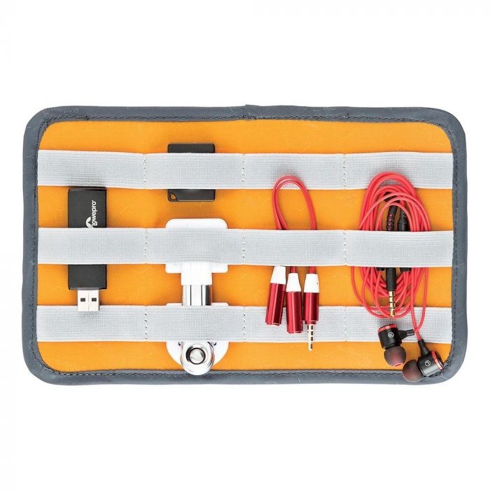 Konstrukce: 13 kompresních oček (z toho 9 na oboustranném vyjímatelném panelu) pro organizované uložení příslušenství (kabely, krytky, karty, redukce, adaptéry, baterky, nabíječky atd.), dvě pouzdra na suchý zip na druhé straně vyjímatelného panelu.