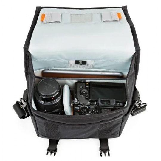 - Prostor hlavní komory lze pomocí oddělovacích přepážek na suché zipy modulárně přizpůsobit individuálním potřebám fotografa a objemu uložené techniky
