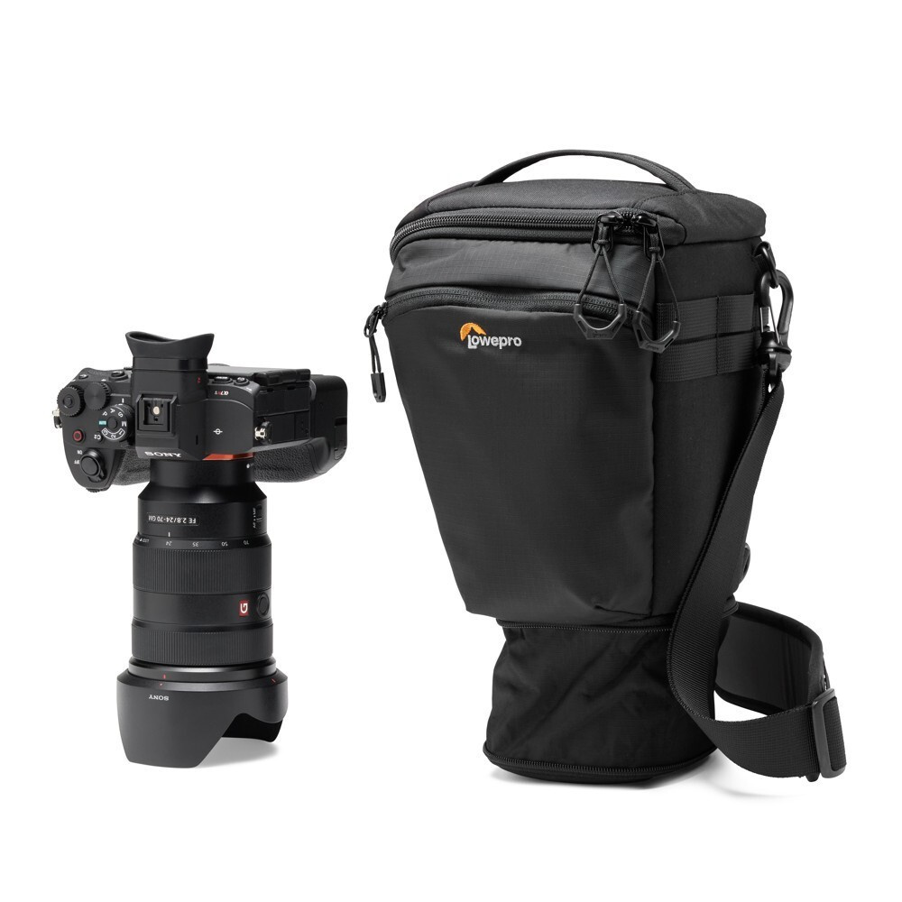 TopLoader pojme plnoformátové tělo s gripem a objektivem až 24–70 mm F2.8 s rozšířením pro sluneční clonu.