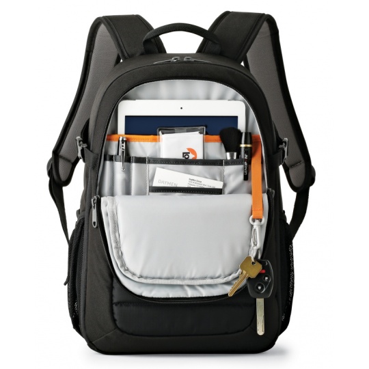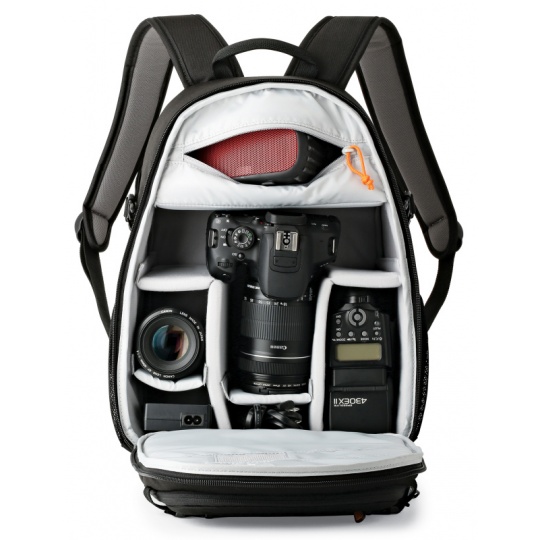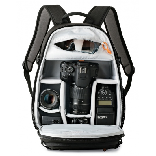 Jednokomorový foto batoh s velkou přední kapsou na osobní věci a příslušenství ● prostor v hlavní foto komoře lze individuálně zorganizovat - podle objemu foto výbavy a množství osobních věcí. Lowepro systém flexibilních oddělovacích příček včetně UltraFlex™ panelu umožňuje přizpůsobit batoh přesně tak, jak potřebujete ● UltraFlex™ kapsa na příslušenství v hlavní fotokomoře. Kapsu lze „složit“ a rozšířit tak prostor foto komory pro uložení objemnější foto výbavy ● velká přední kapsa na osobní věci - promyšlené vnitřní členění, prostor na psací potřeby, karabina pro uchycení klíčů, polstrovaná CradleFit™ kapsa na 10“ tablet ● praktická kapsa na zip na přední straně víka - pro uložení drobných věcí, které je třeba mít stále „po ruce“ (psací potřeby, klíče, telefon atd.) ● 2 boční síťové kapsy z transparentního technického „stretch“ materiálu - pro uložení láhve, malého stativu a dalších praktických věcí ● měkké, dobře polstrované ramenní popruhy ● dva kompresní pásky s karabinami na bočních stranách batohu – pro stažení a fixaci hlavní komory nebo uchycení stativu v boční kapse ● pásková rukojeť pro přenášení batohu podél těla