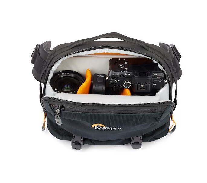 K dispozici je malá přední kapsa na zip pro klíče, telefon nebo jiné drobnosti; a hlavní zip umožňuje přístup do prostoru pro fotoaparát. Dvojice popruhů umožňuje připevnit ke spodku stolní stativ nebo bundu. Na vnitřní straně tašky najdete v příslušenství držák na láhev s vodou, který lze použít s popruhy.