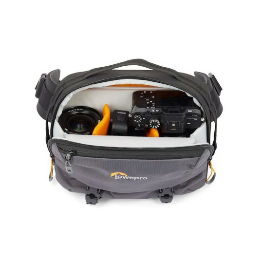 K dispozici je malá přední kapsa na zip pro klíče, telefon nebo jiné drobnosti; a hlavní zip umožňuje přístup do prostoru pro fotoaparát. Dvojice popruhů umožňuje připevnit ke spodku stolní stativ nebo bundu. Na vnitřní straně tašky najdete v příslušenství držák na láhev s vodou, který lze použít s popruhy.