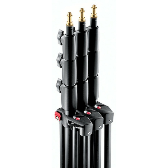 Stativ má 4 sekce se 3 stoupačkami. Je vybaven vzduchovým tlumením, takže můžete pracovat rychle, aniž byste se museli obávat poškození zařízení v důsledku náhodného uvolnění stoupačky. Široká plocha se otevírá až do 107 cm, vaše snímky tak budou stabilní i na drsnějších terénech. Dodává se také se standardními a snadno kompatibilními doplňky, obsahující 16 mm (5/8 ”) horní čep a 9,5 mm (3/8”) nebo 6,4 mm (1/4 ”) závit. Jeho působivý výškový rozsah od 124 cm do 366 cm umožňuje pozvednout osvětlovací zařízení do nových výšin!