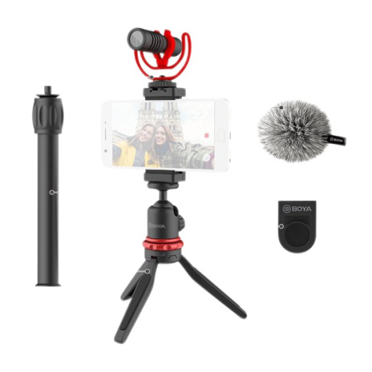 Sada BY-VG330 Smartphone Vlogger Kit s mikrofonem BY-MM1 a příslušenstvím od BOYA obsahuje shotgun mikrofon BY-MM1 na kameře a několik užitečných doplňků k vytvoření lehkého a přenosného A/V zařízení pro smart telefony pro tvůrce videí na YouTube, online osobnosti, mobilní novináři a další.