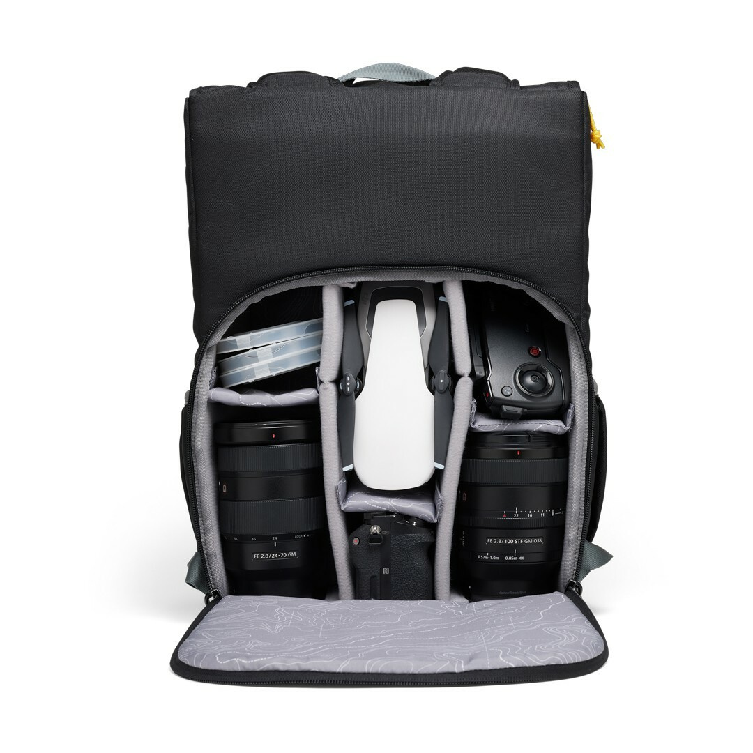 Batoh je ideální pro digitální zrcadlovky a bezzrcadlovky s 3-4 dodatečnými objektivy. Můžete v něm také uložit svůj dron, ovladač, nabíječku a příslušenství. Na bočních stranách batohu jsou pružné kapsy, kam si můžete dát vodu nebo malý stativ.