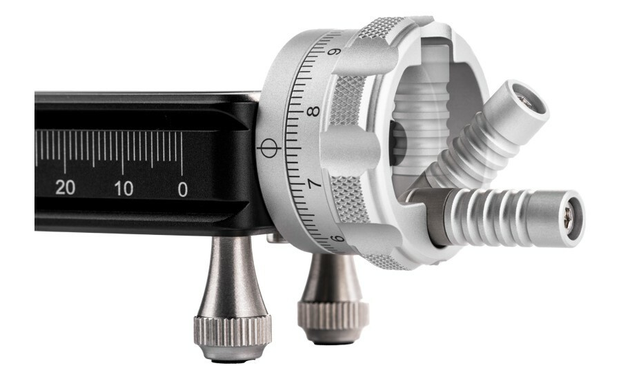 Macro Rail lze namontovat na většinu svorek/kulových hlav typu Arca na trhu a obsahuje také čtyři odnímatelné patky s hřebíky, které umožňují použití lišty přímo na desce stolu.