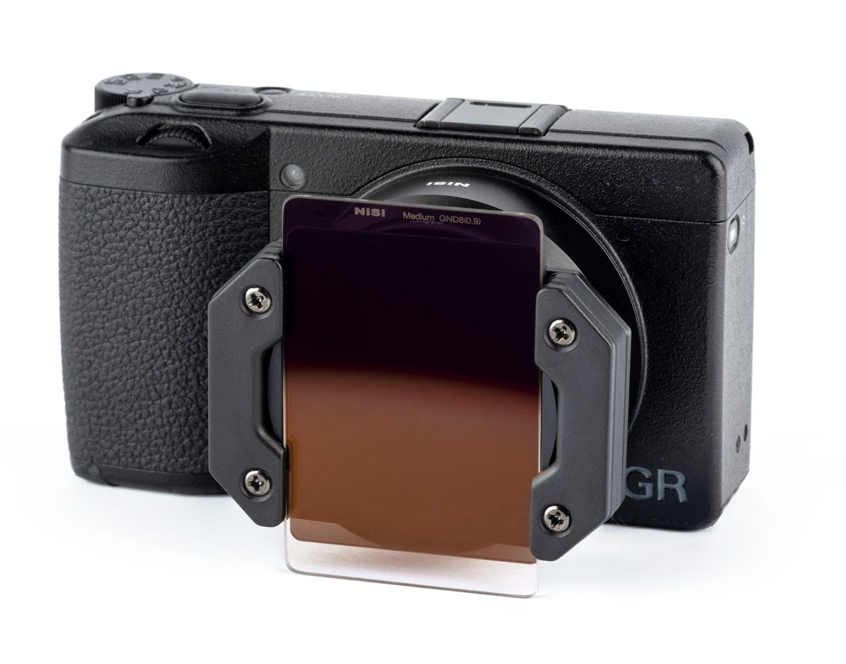 Sada filtrů pro fotoaparát Ricoh GR III včetně příslušenství k jejich upevnění.