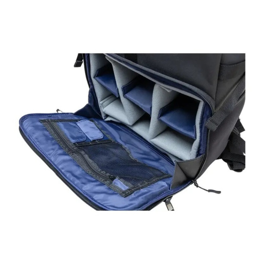 Bederní a hrudní popruhy si nastavíte podle potřeby. Kvalitně podšité ramenní popruhy poskytují vysoký komfort při dlouhém nošení. Černá tkanina, ze které je batoh vyrobený, odpuzuje vodu. Vyztužené dno modrou vnitřní podšívkou je odolné vůči nečistotám. Batoh je ideální na fotografování, outdoorové aktivity i každodenní nošení.