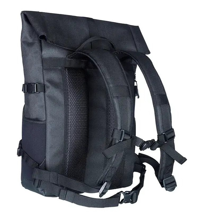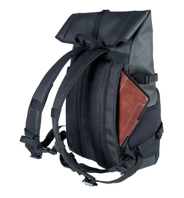 Horní část batohu můžete srolovat. To společně se zipovou kapsou na přední straně umožňuje rychlý přístup k vašim věcem. Vnitřní strana zipové kapsy obsahuje přihrádky na paměťové karty, dokumenty nebo jiné příslušenství. Nespadne úplně dolů, ale vějířovitě se rozkládá, takže při otevření nevypadnou žádné produkty.