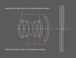 GR IV HDF: 18,3 mm (přibližně 28 mm v ekvivalentu ohniskové vzdálenosti 35 mm), F2,8, 7 prvků v 5 skupinách