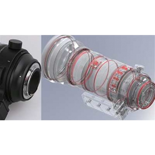 Objektiv se skládá z 24 optických elementů v 16 skupinách s FLD a SLD sklem.