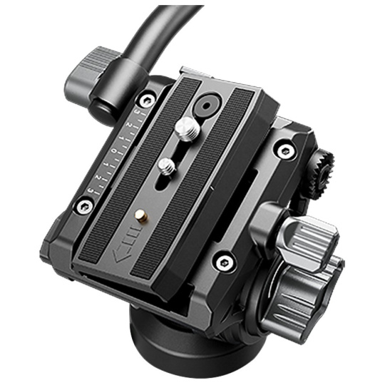 Vysoce výkonný systém tlumení kapalinou zajišťuje náklon -50° ~+90°. Hlava se po uvolnění rukojeti plynule vrátí do výchozí polohy s maximální zátěží 2,5 kg.