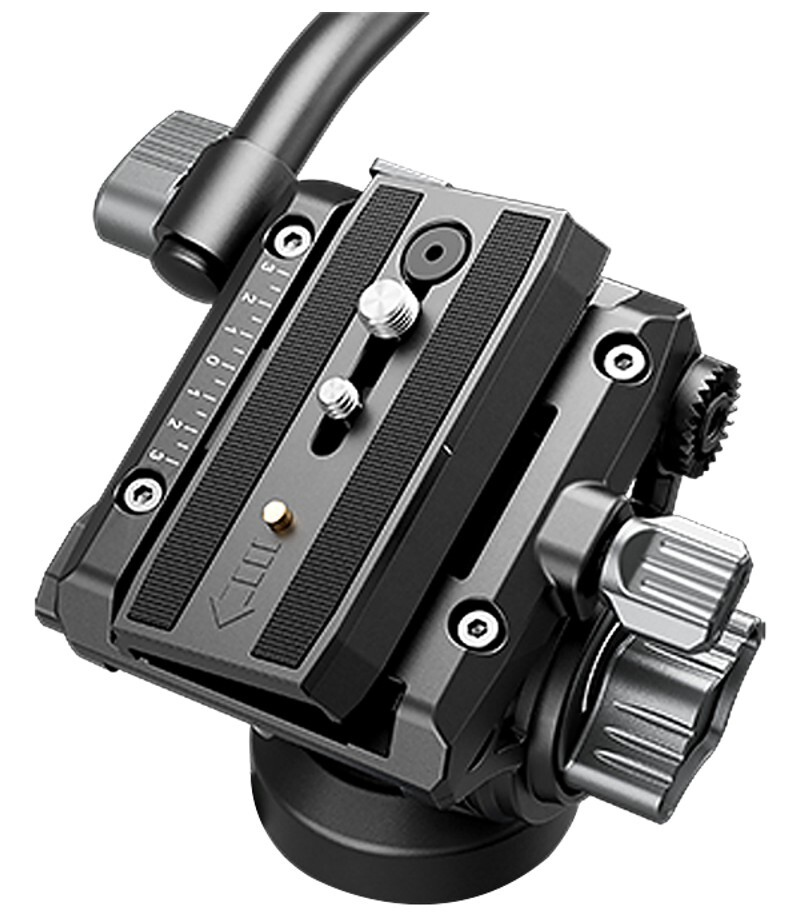 Vysoce výkonný systém tlumení kapalinou zajišťuje náklon -50° ~+90°. Hlava se po uvolnění rukojeti plynule vrátí do výchozí polohy s maximální zátěží 2,5 kg.