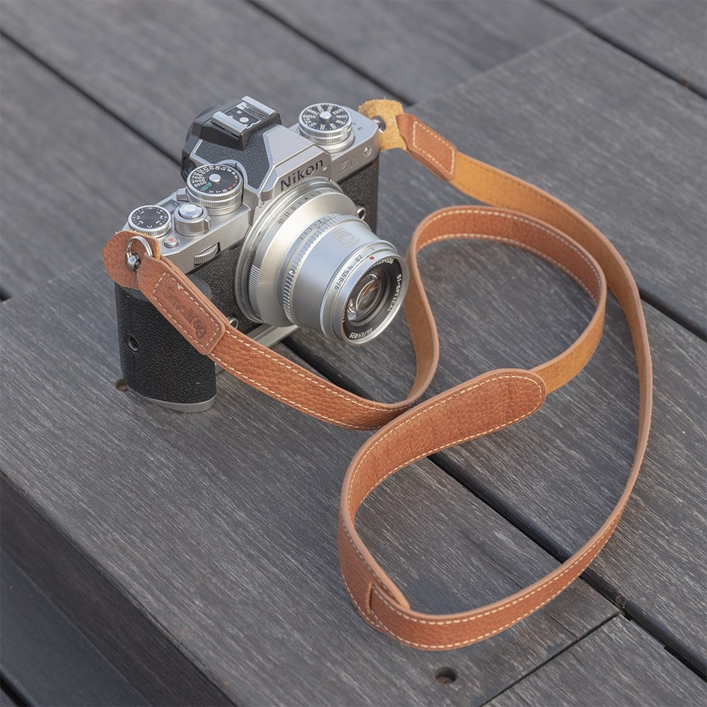Kožený řemínek na fotoaparát je navržen tak, aby vám pomohl nosit fotoaparát přes rameno nebo kolem krku a zároveň zmírnil napětí na vašem rameni. Můžete ho umístit přes jedno rameno, přes tělo nebo kolem krku. Popruh je vyroben z pravé kůže a zadní strana je z měkké semišové látky, která zabraňuje znečištění oblečení při dlouhém nošení. Řemínek na krk má pevnou délku 110 cm s vestavěným systémem uchycení prstencového typu doplněným ochrannými chlopněmi, aby prstence nepoškrábaly tělo fotoaparátu. Řemínek má klasický hnědý design, díky kterému vypadá váš fotoaparát trochu retro.