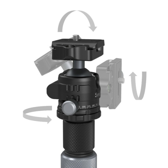 Stativ je vybaven uzamykacím knoflíkem pro rychlé nastavení úhlu mezi třemi zarážkami (23°/55°/85°) a rychloupínací panoramatickou kulovou hlavou Arca-Swiss na horní straně. Hlavu lze otáčet o 360° a naklánět až o 90° pro získání vertikálního záběru.