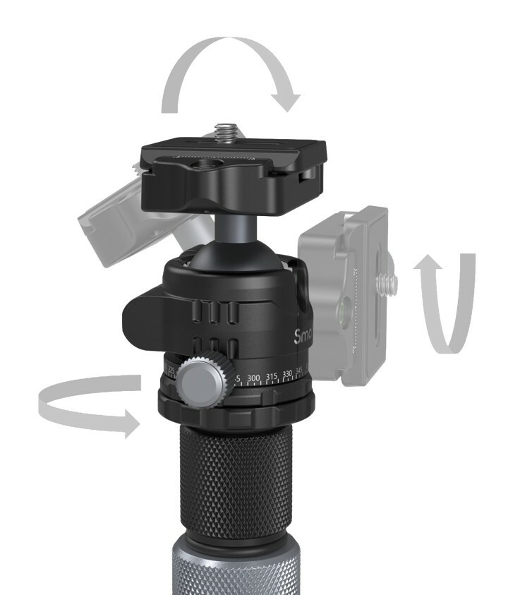 Stativ je vybaven uzamykacím knoflíkem pro rychlé nastavení úhlu mezi třemi zarážkami (23°/55°/85°) a rychloupínací panoramatickou kulovou hlavou Arca-Swiss na horní straně. Hlavu lze otáčet o 360° a naklánět až o 90° pro získání vertikálního záběru.