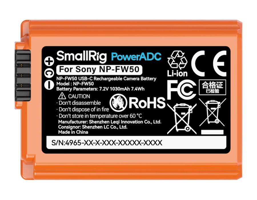 SmallRig 4965 NP-FW50 USB-C Rechargeable Camera Battery Orange
