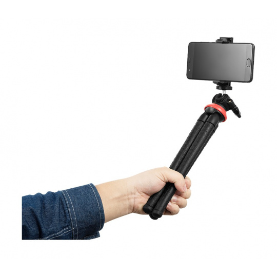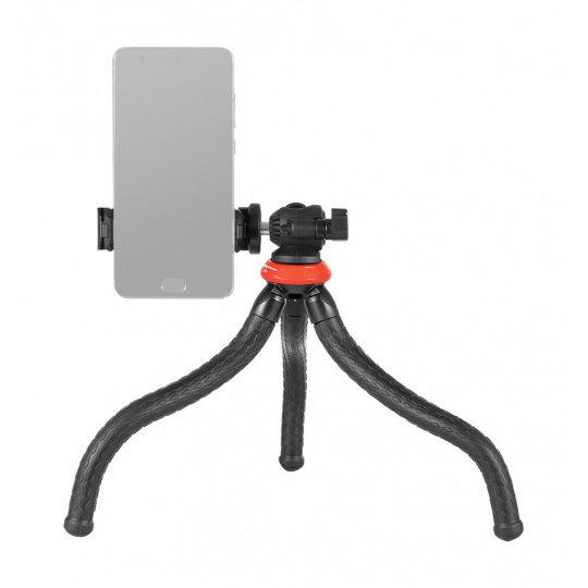Stativ je dodáván s držákem na smartphone pro fotografování na výšku i na šířku. Rozsah držáku je 65-85 mm pro různé modely smartphonů.