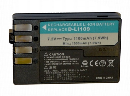 Neoriginální Li-Ion baterie pro Pentax T6 Power nahrazuje D-LI109 pro Pentax KP, K-70, K-30, K-50, K-S1... Kapacita 1100 mAh.