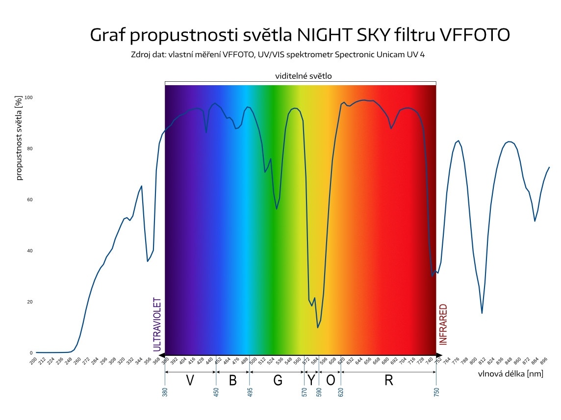 - Že odfiltruje světelné znečištění z různých zdrojů stejnoměrně. Neodfiltruje! Světelné znečištění je tvořeno směsí různých vlnových délek zhruba mezi 570-610 nm. NIGHT SKY filtr VFFOTO je nejúčinnější pro vlnové délky kolem 580 nm, méně filtruje světlo od 590 nm výše, tedy červenou složku (600 nm – propustí cca 25 %).